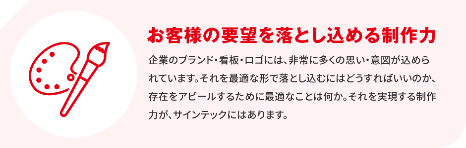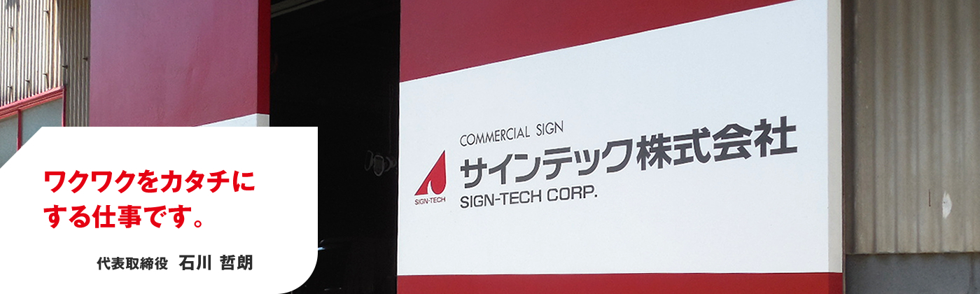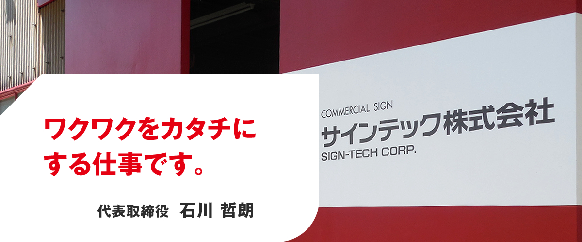 わが社は主にサイン(看板)などの仕事を扱っていますが、取扱商材が幅広く覚えることも多いので、最初は難しく感じるかもしれません。しかし、新しい事を知る度にそれは喜びに変わり、やりがいを感じるはずです。私どもは、そんなやる気を持って仕事に取り組んでくれ、いずれサインテックの主動力となってくれる人材を随時募集しています。新しく会社に入る時は、誰しも不安はあるでしょう。不安と裏腹に希望もあり、希望が膨らむように当社は研修制度やスキルアップ応援制度などでバックアップしていきます。是非、希望を抱いて当社へ入社してください。